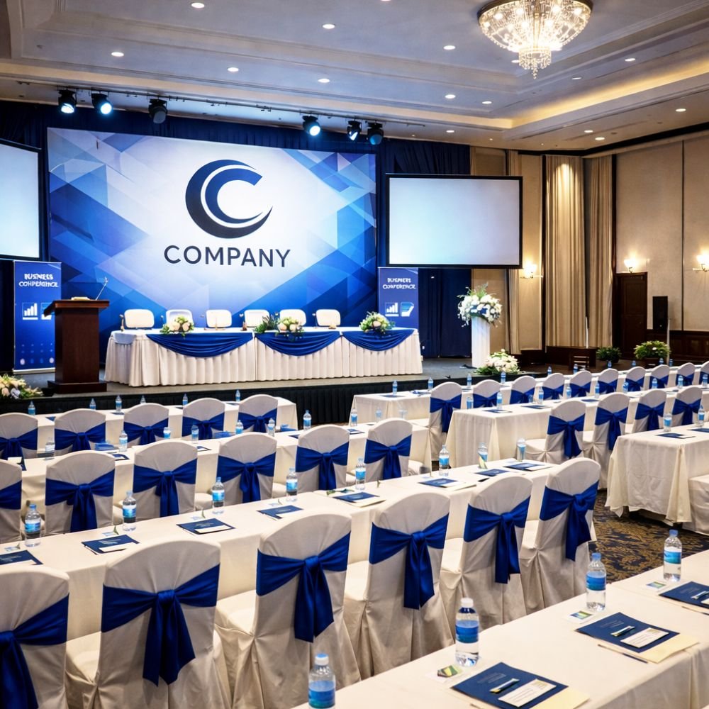 Our conference hall decoration service is carefully planned to suit different types of events, hall sizes, and client requirements. From simple and elegant setups for board meetings to branded and premium decorations for corporate conferences, this service ensures the venue reflects the event’s importance. Every element is selected with attention to detail, including stage backdrops, table arrangements, entrance décor, lighting accents, branding displays, and seating layouts. The goal is to create a clean, organized, and professional environment that leaves a positive impression on attendees.