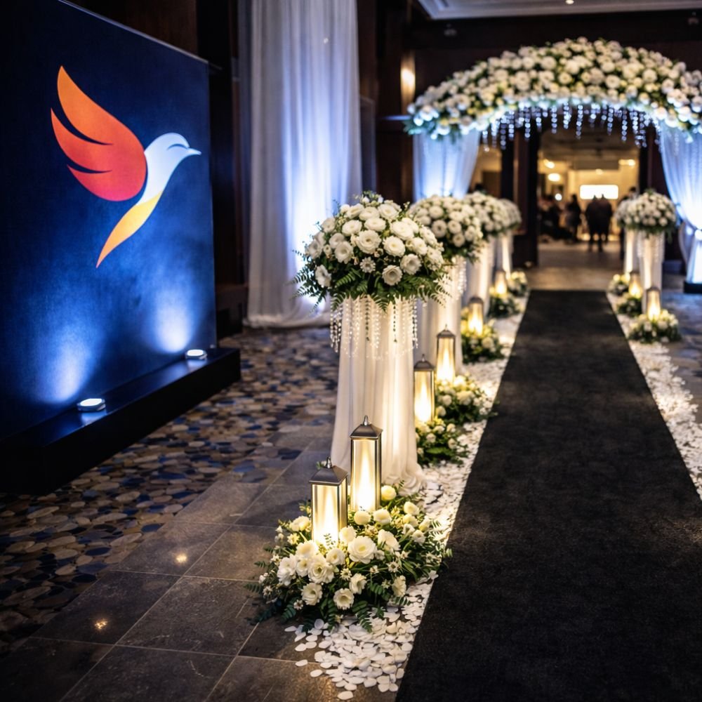 For religious events such as pirith ceremonies, temple functions, church weddings, and cultural programs, walkway decoration helps maintain order and respect. Simple designs using white fabric, lamps, and floral elements are often preferred to match traditional values.